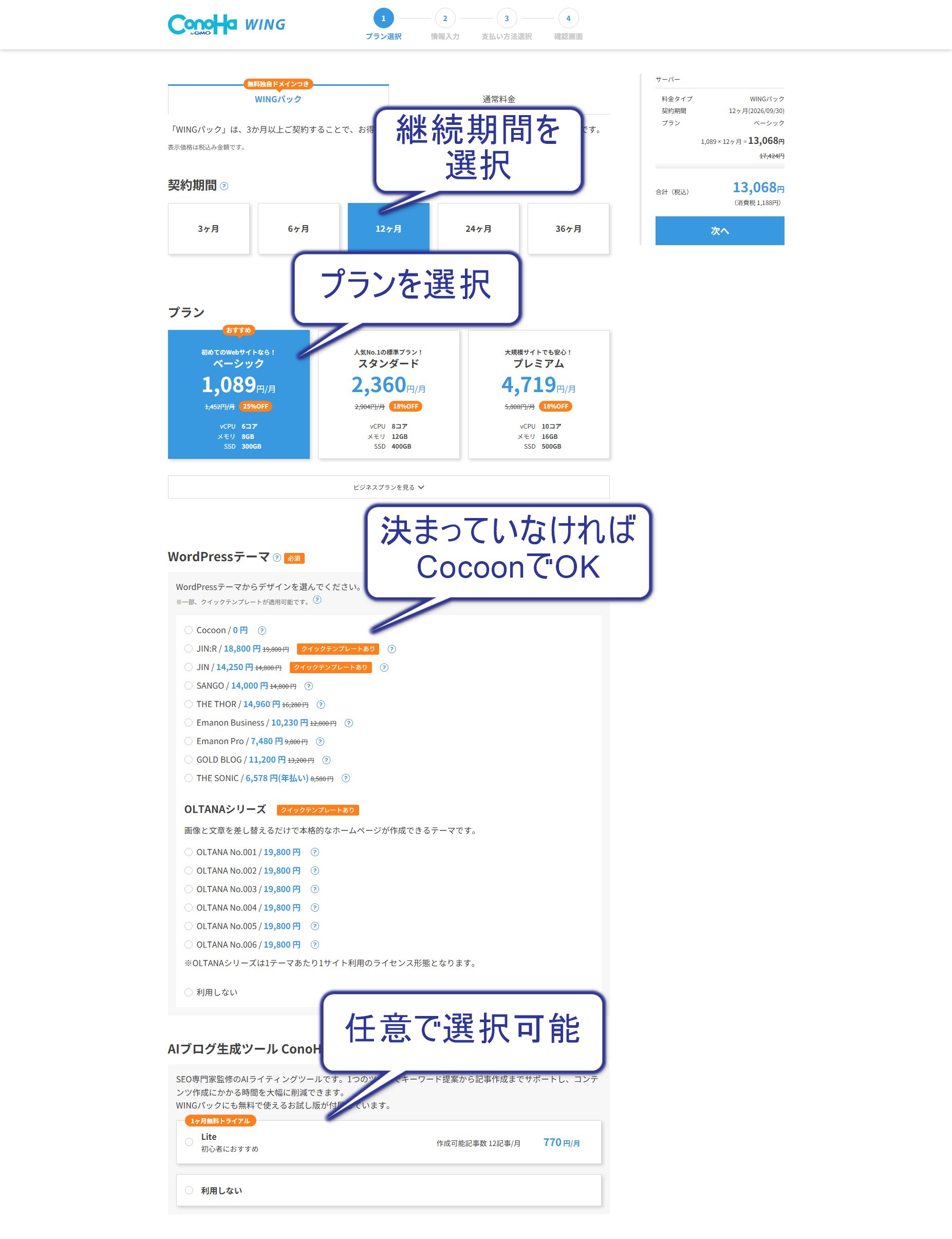[WINGパック] のタブをクリックしたら「契約期間」と「プラン」を選択してください。ここでは [12か月] で [ベーシック] を選択します。